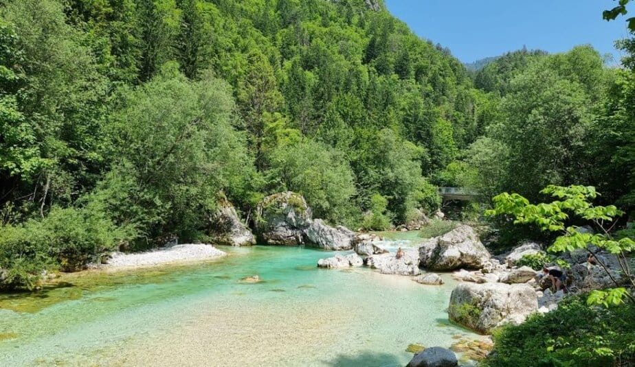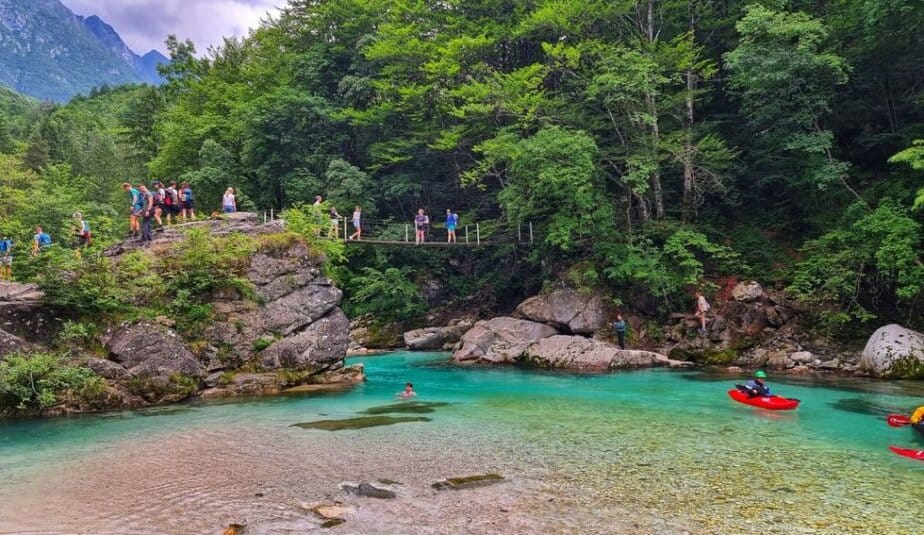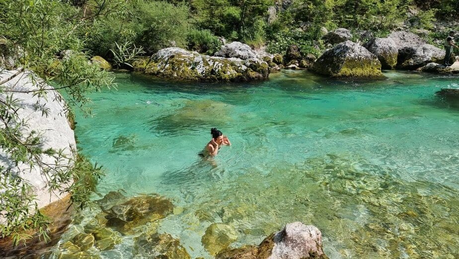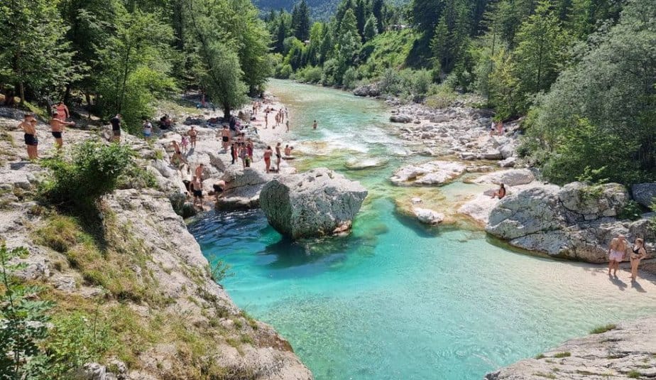 Ob koncu korit je verjetno najbolj priljubljeno kopališče na celotnem 128 kilometrskem toku Soče. V poletnih mesecih se tu zbere po več 100 kopalcev, radovednežev, sprehajalcev… Temperatura vode pa tu tudi v poletni pripeki ne preseže 10°C, zato je skok v vodo še toliko večji izziv. 😀